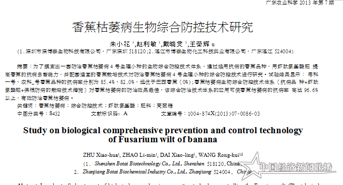 博泰公司通過多次試驗,早在2013年,博泰公司的科研總部深圳深博泰公司就曾在《廣東農(nóng)業(yè)科學》雜志上發(fā)表過關于香蕉枯萎病生物綜合防控技術研究的報告,其中詳細的列舉了博泰公司對香蕉枯萎病防治研究及實驗的方法與結(jié)果,文章中充分證實了蝦肽氨基酸肥及保根防病栽培的綜合防控技術體系對香蕉枯萎病的作用,達到了一個新的高度。
