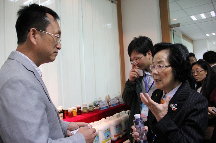圖為 博泰公司董事長(zhǎng)王榮輝向張俐娜院士講解公司的甲殼素產(chǎn)品