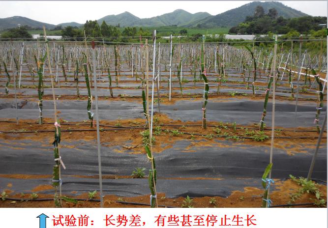 試用前期的火龍果的狀況:生產(chǎn)情況緩慢,甚至有些停止生長,總體生長差異較大。土壤酸性化(PH 3.89),根部有腐爛。