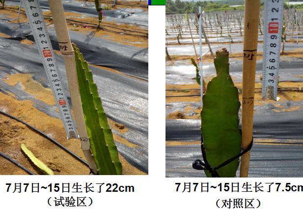 2、施用蝦肽酸性土壤調(diào)理液+根苗壯后,試驗(yàn)區(qū)的火龍果的根部比對(duì)照區(qū)生長得更長、更粗壯,莖條比對(duì)照區(qū)生長更快(一個(gè)星期平均多長5cm左右)。原來停止生長的火龍果也開始生長伸長。
