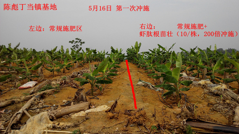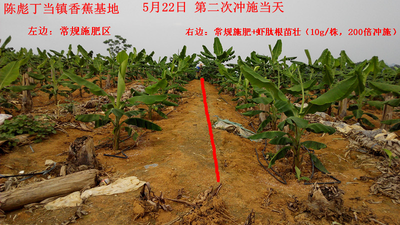 在圖中可以明顯地看出右邊施加蝦肽根苗壯的香蕉葉數(shù)比較多,葉色相對(duì)青翠。左邊的明顯葉數(shù)少,葉子帶少許黃化。