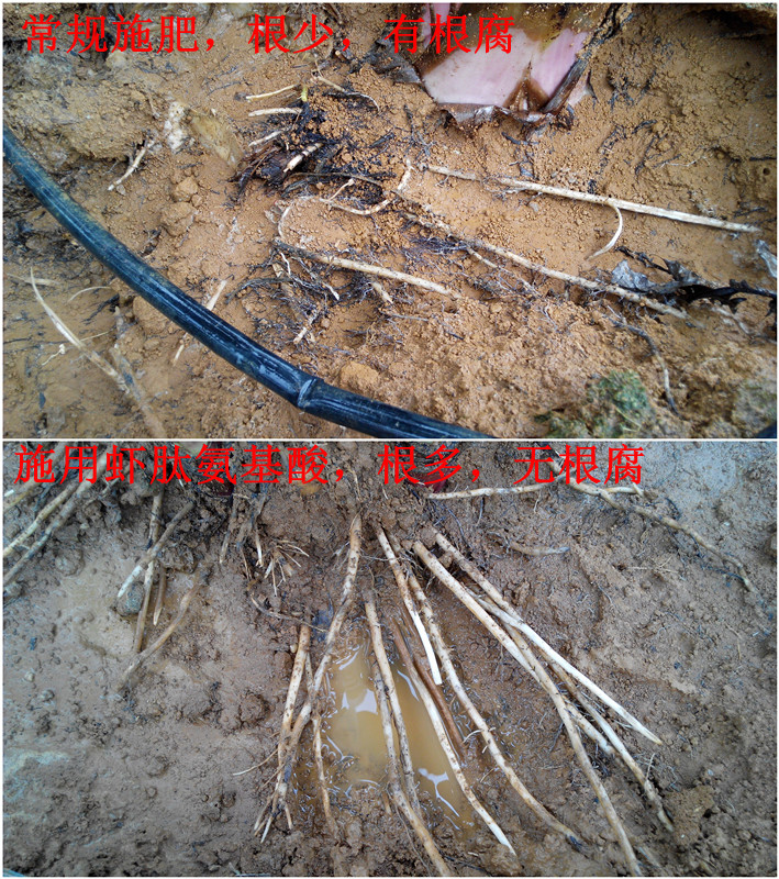 試驗(yàn)方法:對(duì)同一地點(diǎn)分別同時(shí)對(duì)香蕉施加常規(guī)肥料和蝦肽根苗壯,觀察香蕉的生長情況和根部的觀察。