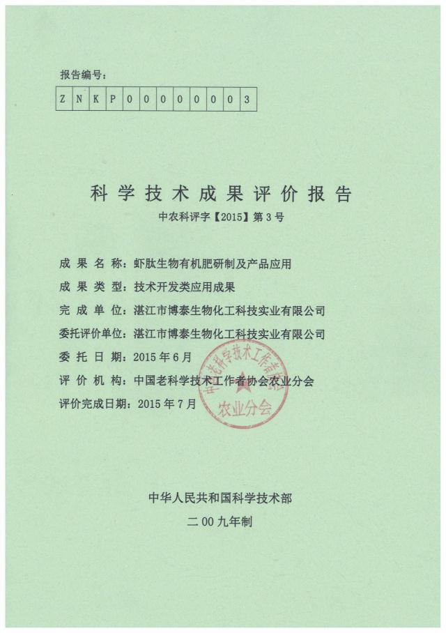 圖為 蝦肽生物有機(jī)肥的科學(xué)技術(shù)成果評(píng)價(jià)報(bào)告